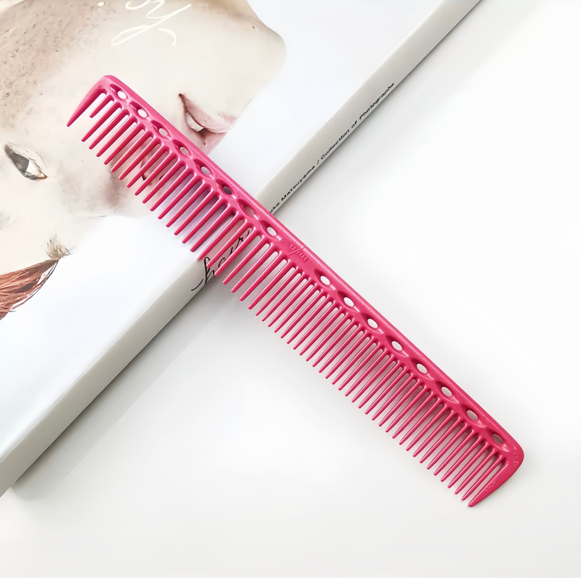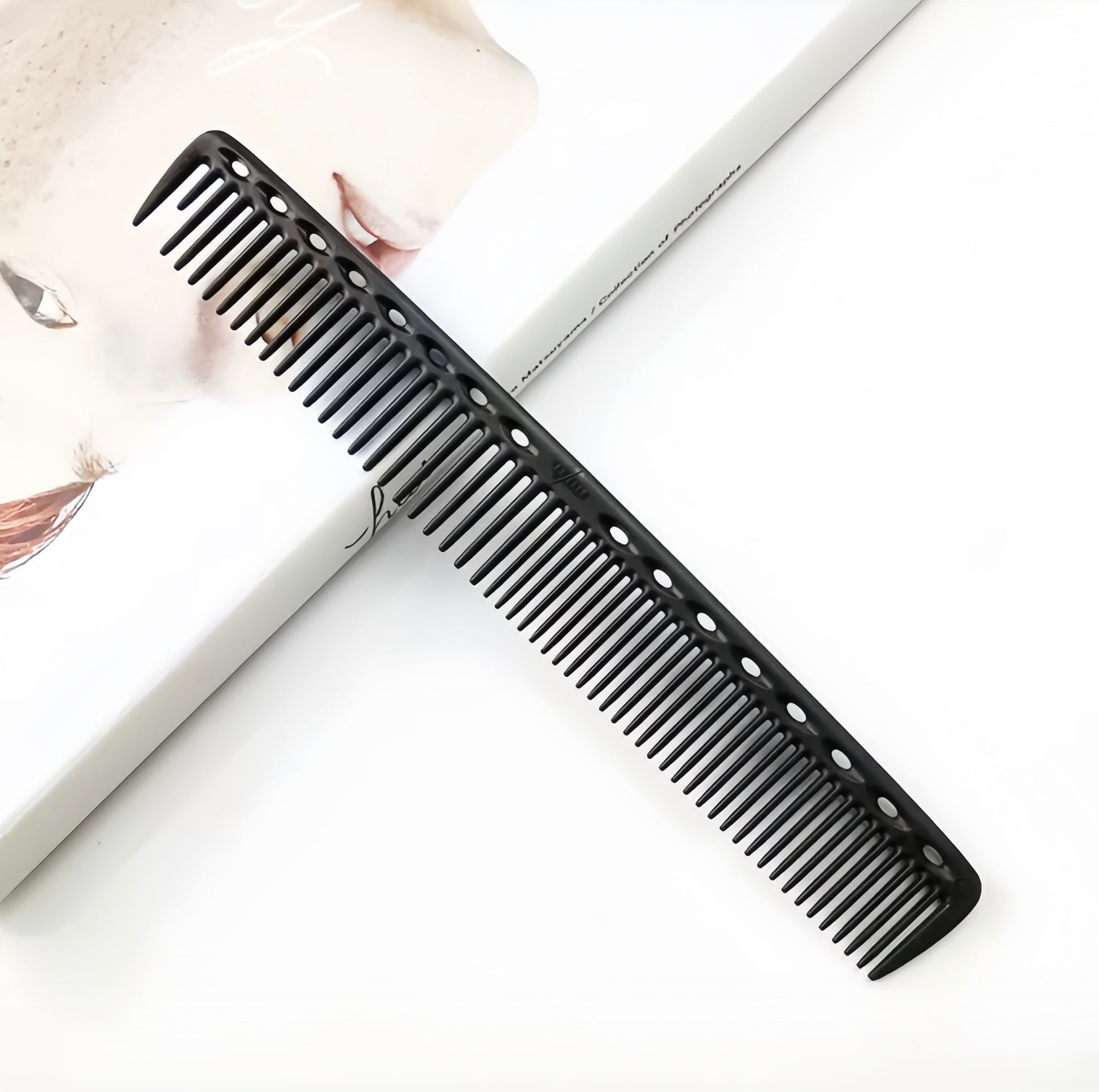 ·Shortened first tooth for separating hair easily and quickly. ·Round teeth to mimic human fingers which minimises damage and keeps even tension at all angles. ·2 different teeth spacing - regular and wide ·Made from imido plastic, which is up to 220°C heat resistant, chemical resistant and has a strong yet flexible body. ·Built in measuring system through the holes - spaced 1cm apart ·Length: 190mm